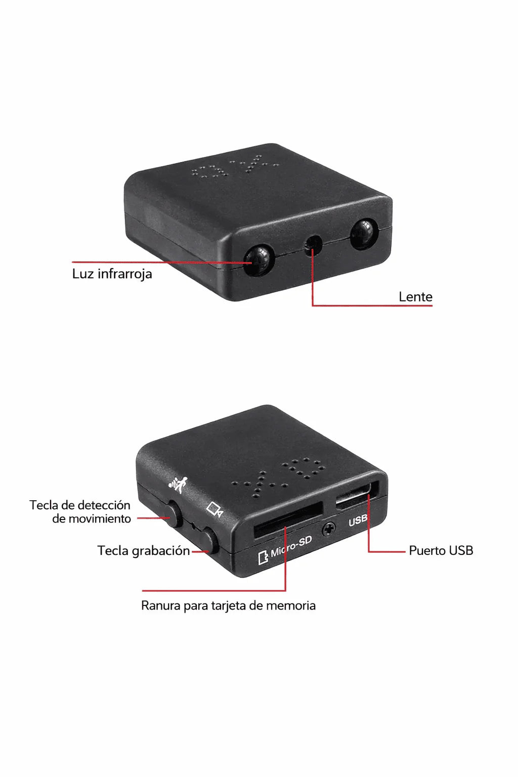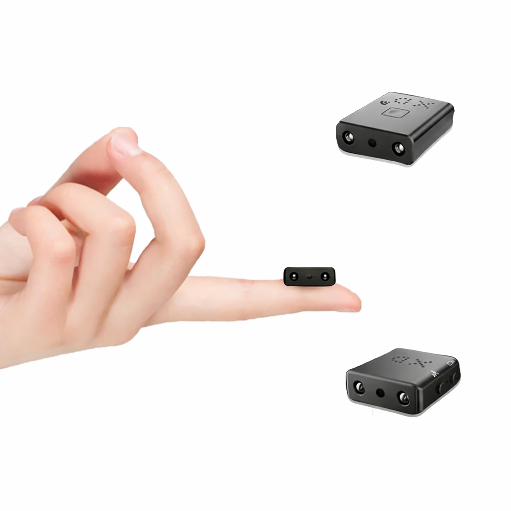 Mini cámara discreta para vigilancia doméstica con grabación Full HD 1080p. Visión nocturna infrarroja automática y detección de movimiento integrada. Compatible con tarjeta microSD hasta 32 GB. Diseño ultracompacto de apenas 50 g. Incluye lector de tarjetas y cable USB.